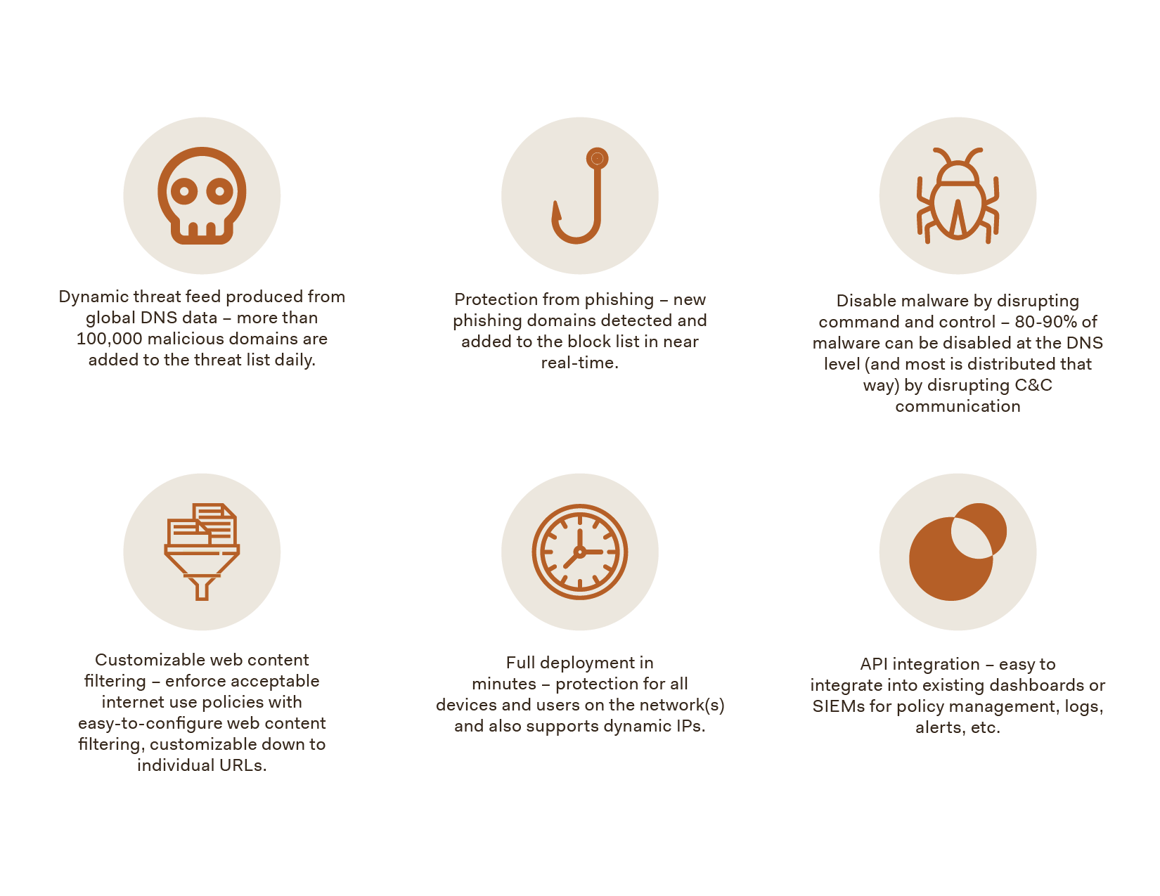 The service’s powerful threat feeds block cyber threats like malware, phishing, and botnets as they arise, while its customizability allows organizations to add specific sites they don’t want users visiting.